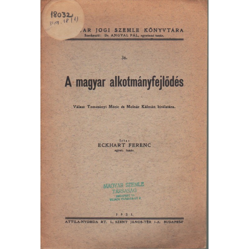 | Sorozatcím | Magyar Jogi Szemle Könyvtára |