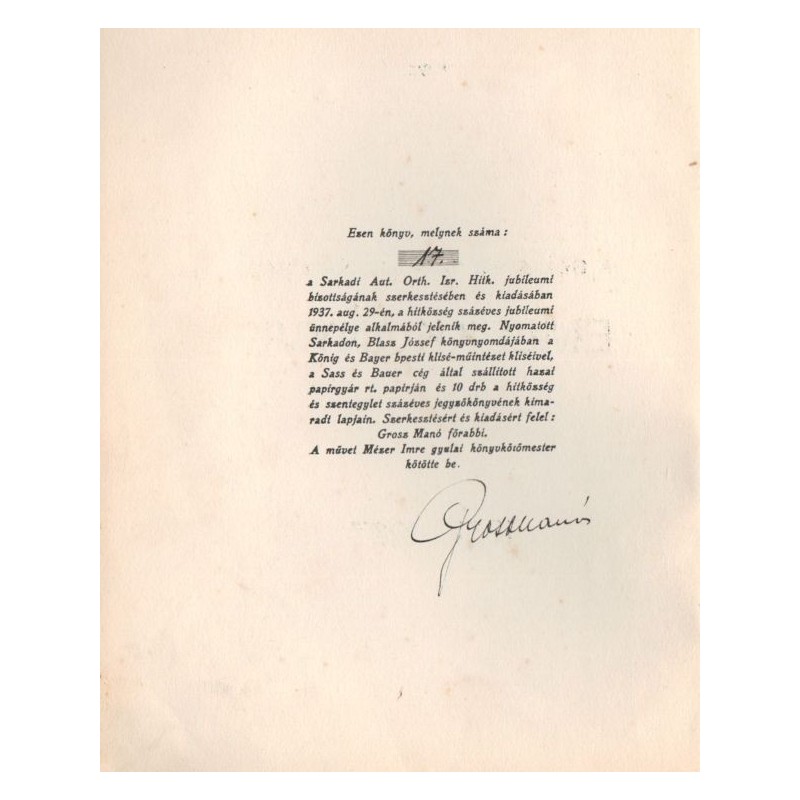 A százéves sarkadi zsidóság emlékkönyve 1837-1937 (aláírt)