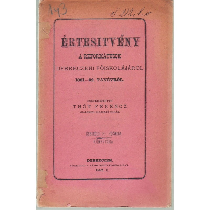 Értesítvény a reformátusok debreczeni főiskolájáról 1881-82