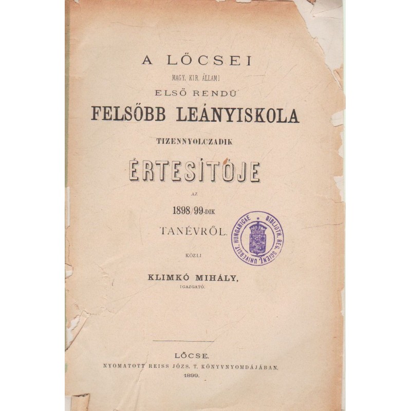 Lőcsei M.Kir.állami első rendű felsőbb leányiskola értesítője 1898-1899