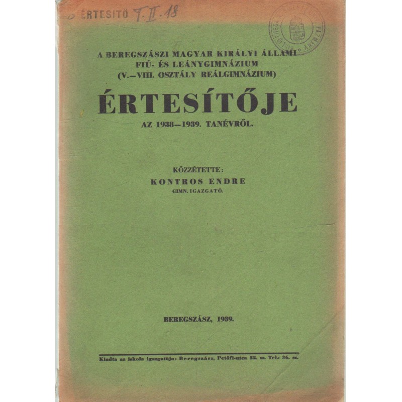 Beregszászi M. Kir. állami fiú-és leánygimnázium értesítője 1938-1939