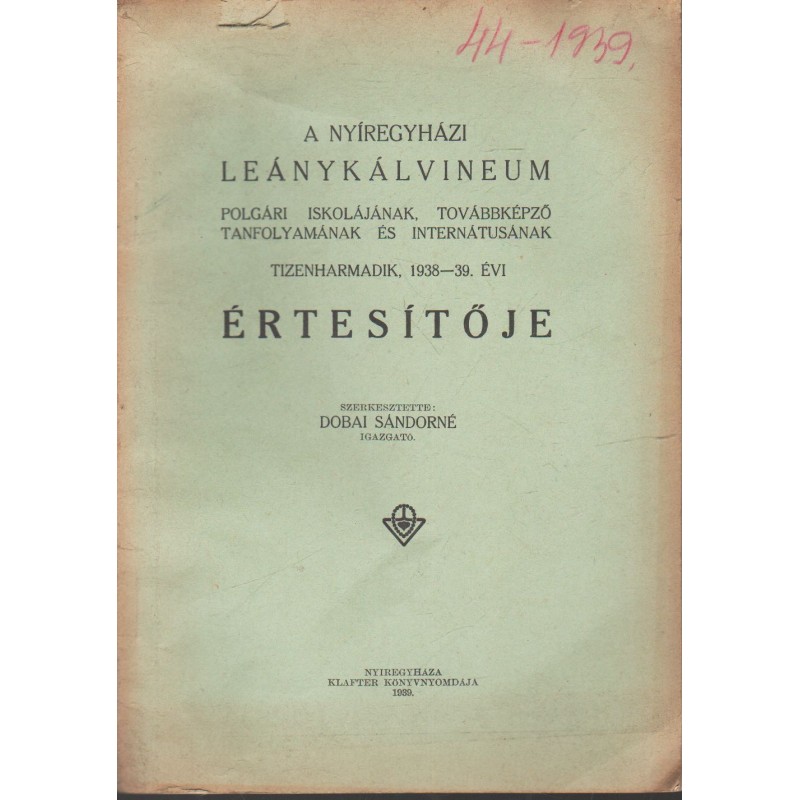 Nyíregyházi leánykálvineum polg.i iskolájának,továbbképző tanfolyamának és internátusának értesítője 1938-1939