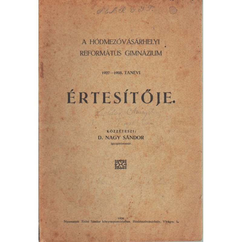 A Hódmezővásárhelyi Református Gimnázium 1927-1928. tanévi értesítője