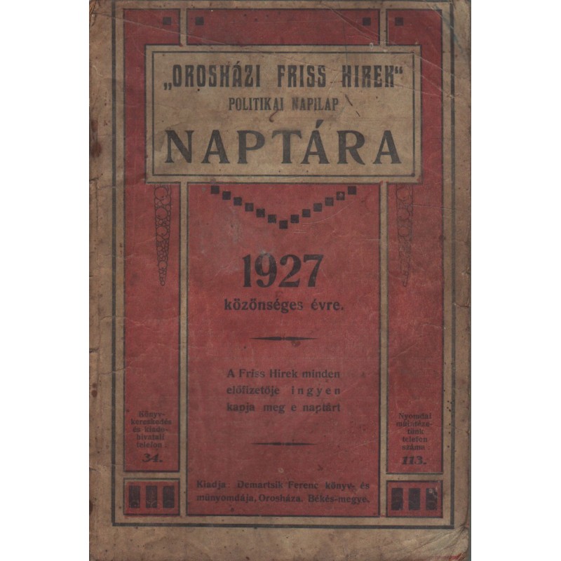 Orosházi "Friss Hirek" naptára az 1927-ik közönséges esztendőre