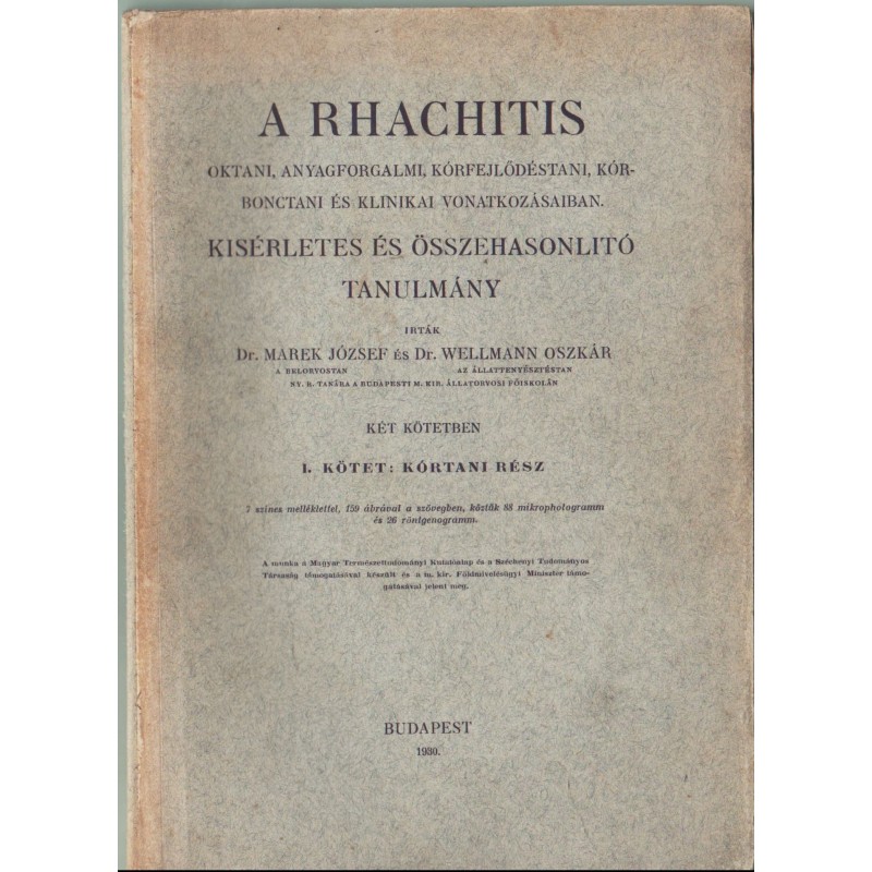 7 színes melléklettel, 159 ábrával a szövegben, köztük 88 mikrophotogramm és 26 röntgenogramm. A mű 2 kötetben teljes, csak 1. kötet. I. kötet: Kórtani rész Foltos borító!Címzett :