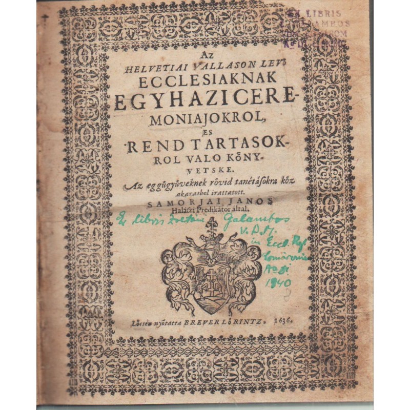 Az helvetiai vallason levö ecclesiaknak egyhazi ceremoniajokro, es rend tartasokrol valo könyvetske