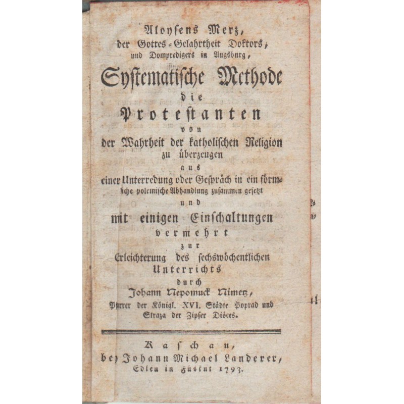 Szisztematikus módszert protestánsok meggyőzni őket az igazság a katolikus vallás ... verm együtt jog és néhány betoldások. Megkönnyítésére a hat heti leckéket Johann Nepomuk Nimetz / Aloys Merz.